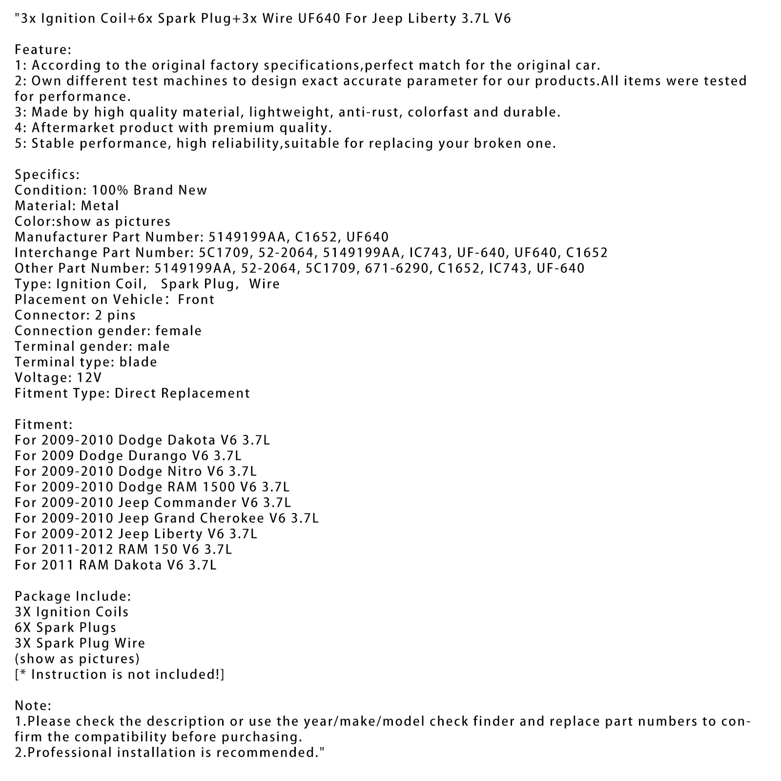 2009-2010 Dodge Nitro V6 3,7 l 3x Zündspule + 6x Zündkerze + 3x Kabel UF640