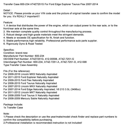 2011–2012 Lincoln MKT Verteilergetriebe mit Saugmotor 600–234 AT4Z7251G AT4Z7251D