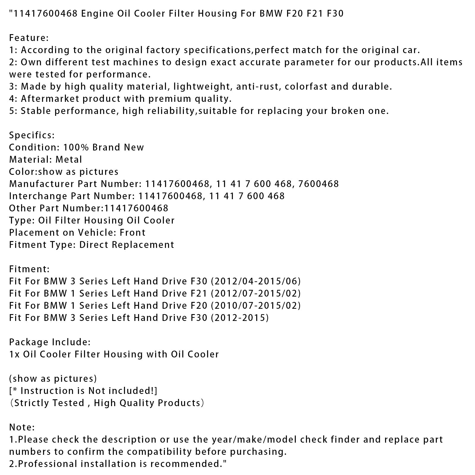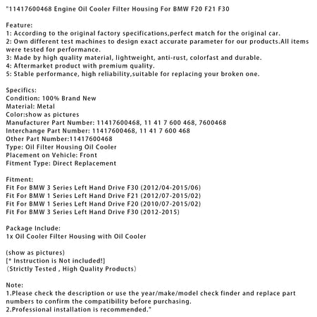 2012/07-2015/02 BMW 1 Series Linkslenker F21 Motorölkühler Filtergehäuse 11417600468
