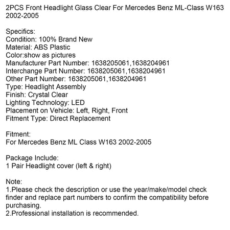 2 STÜCKE Frontscheinwerferglas Klar Für Mercedes Benz ML-Klasse W163 2002-2005