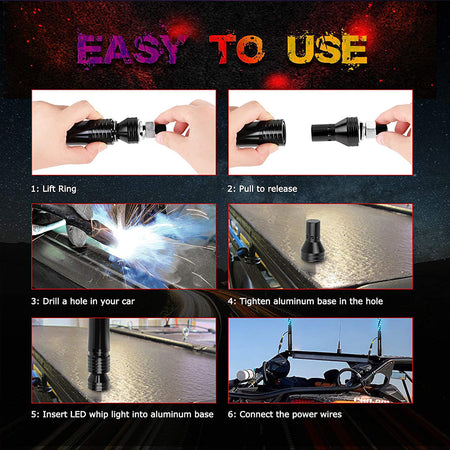 EINFACHE INSTALLATION – Die Installation ist wirklich schnell und einfach, da die beleuchteten Peitschen mit Plug-and-Play-Komponenten geliefert werden, die jeder schnell zusammenbauen kann. Schieben Sie die Schnelltrennbasis zum L?sen nach ?OBEN“, bohren Sie dann ein Loch, um die LED-Peitsche festzuziehen, schlie?en Sie das Batteriekabel an und schlie?lich k?nnen Sie es steuern, indem Sie einfach eine Fernbedienung steuern