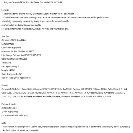 2x Tailgate Cable M159508 For John Deere Gator HPX615E HPX815E