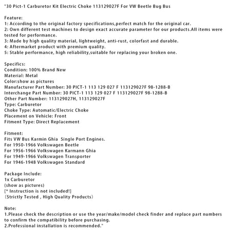 30 Pict-1 Vergaser Kit Elektrische Choke 113129027F Für VW Beetle Bug Bus