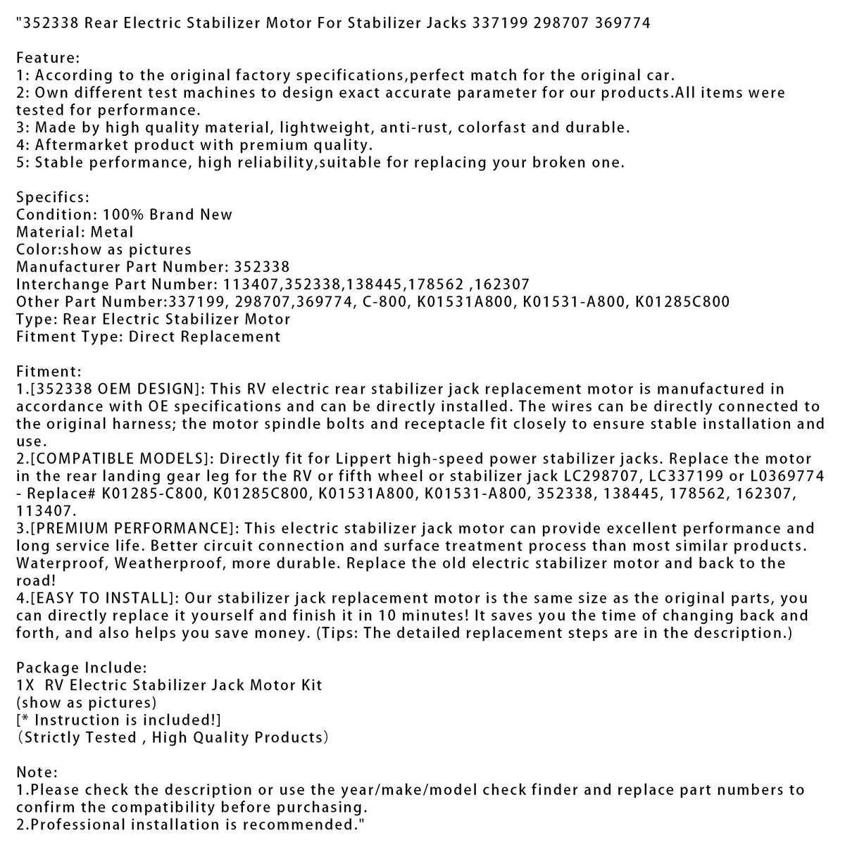 2. [KOMPATIBLE MODELLE]: Passt direkt zu Lippert-Hochgeschwindigkeits-Stabilisatorhebern. Ersetzen Sie den Motor im hinteren Fahrwerksbein für das Wohnmobil oder die Sattelkupplung oder den Stabilisatorheber LC298707, LC337199 oder L0369774 – Ersetzen Sie Nr. K01285-C800, K01285C800, K01531A800, K01531-A800, 352338, 138445, 178562, 162307, 113407.