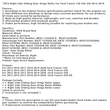 3 STüCKE Rechte Seite Schiebetür Scharnier Roller Fit Für Ford Transit 150 250 350 2015-2019