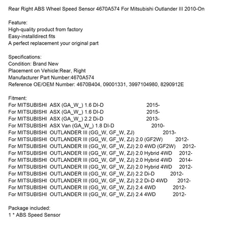 4670A574 ABS-Raddrehzahlsensor hinten rechts Mitsubishi Outlander III ab 2010