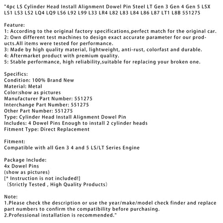4-teiliger LS-Zylinderkopf-Einbau-Ausrichtungs-Passstift aus Stahl LT Gen 3 Gen 4 Gen 5 LSX LS1 LS3 LS2 LQ4 LQ9 LS6 L92 L99 L33 LR4 L82 L83 L84 L86 L87 LT1 L8B 551275