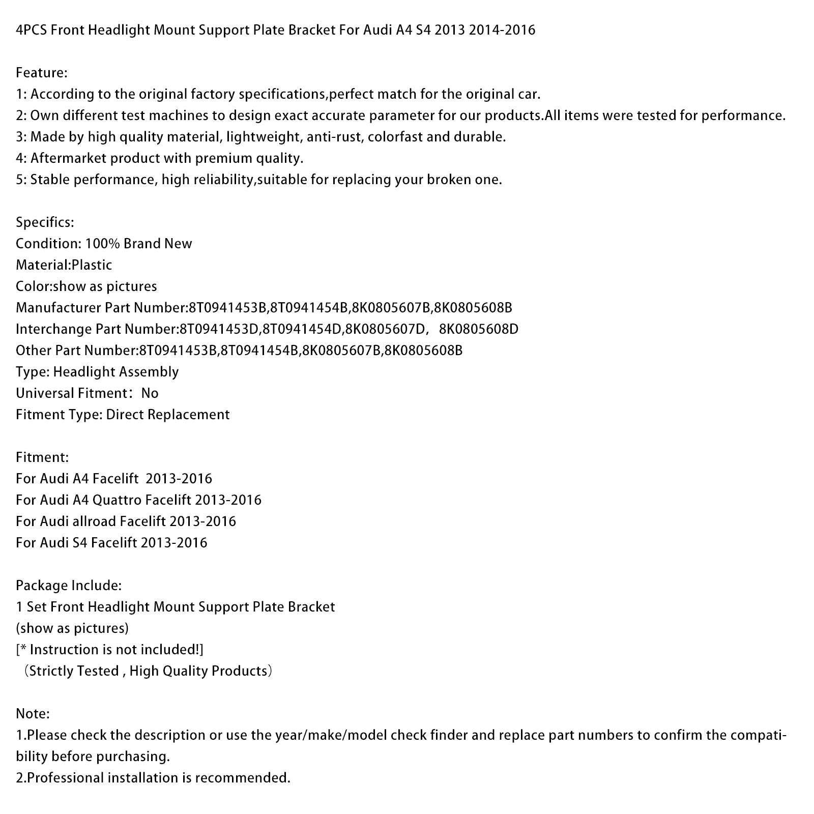 4-teiliges Set Frontscheinwerfer-Halterungsplatten passend für Audi A4 S4 2013 2014-2016