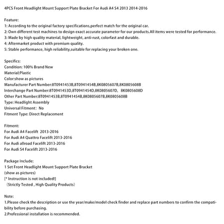 4-teiliges Set Frontscheinwerfer-Halterungsplatten für Audi A4 S4 2013 2014-2016