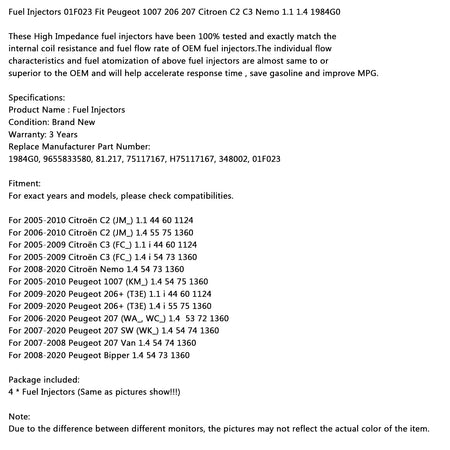 4 Stück Einspritzdüse 01F023 passend für Peugeot 1007 206 207 Citroen C2 C3 Nemo 1.1 1.4 Generic