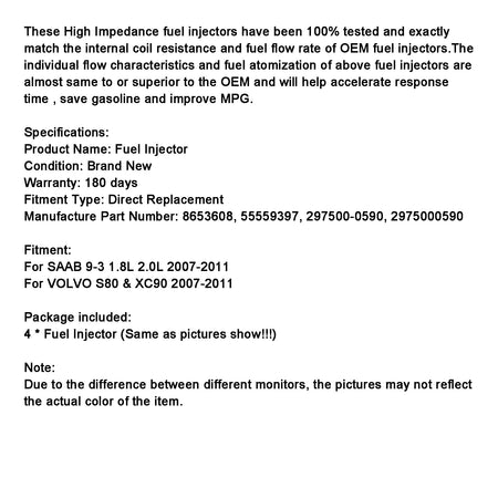 4 Stück Einspritzdüsen passend für SAAB 9-3 2.0L Turbo 2007-2011 8653608 55559397