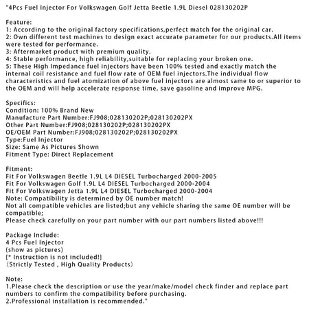 4 Stück Einspritzdüsen für Volkswagen Golf Jetta Beetle 1.9L Diesel 028130202P