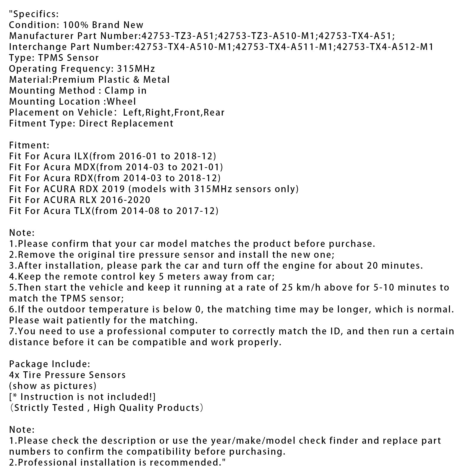 4X TPMS Reifendrucksensor Für Acura MDX RDX TLX ILX 42753TZ3A51