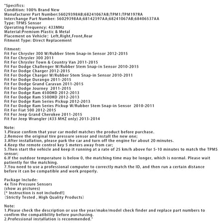4X TPMS Reifendrucksensor Für Dodge Jeep Chrysler RAM 56029398AB