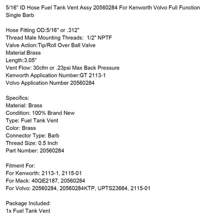 5/16 ""ID Schlauch Kraftstoff Tank Vent Assy 20560284 Für Kenworth Volvo Volle Funktion Einzigen Barb