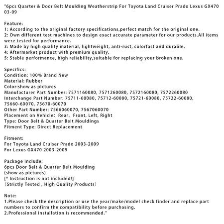 2003–2009 Toyota Lexus GX470 6 Stück Viertel & Tür Gürtel Moulding Dichtungsstreifen