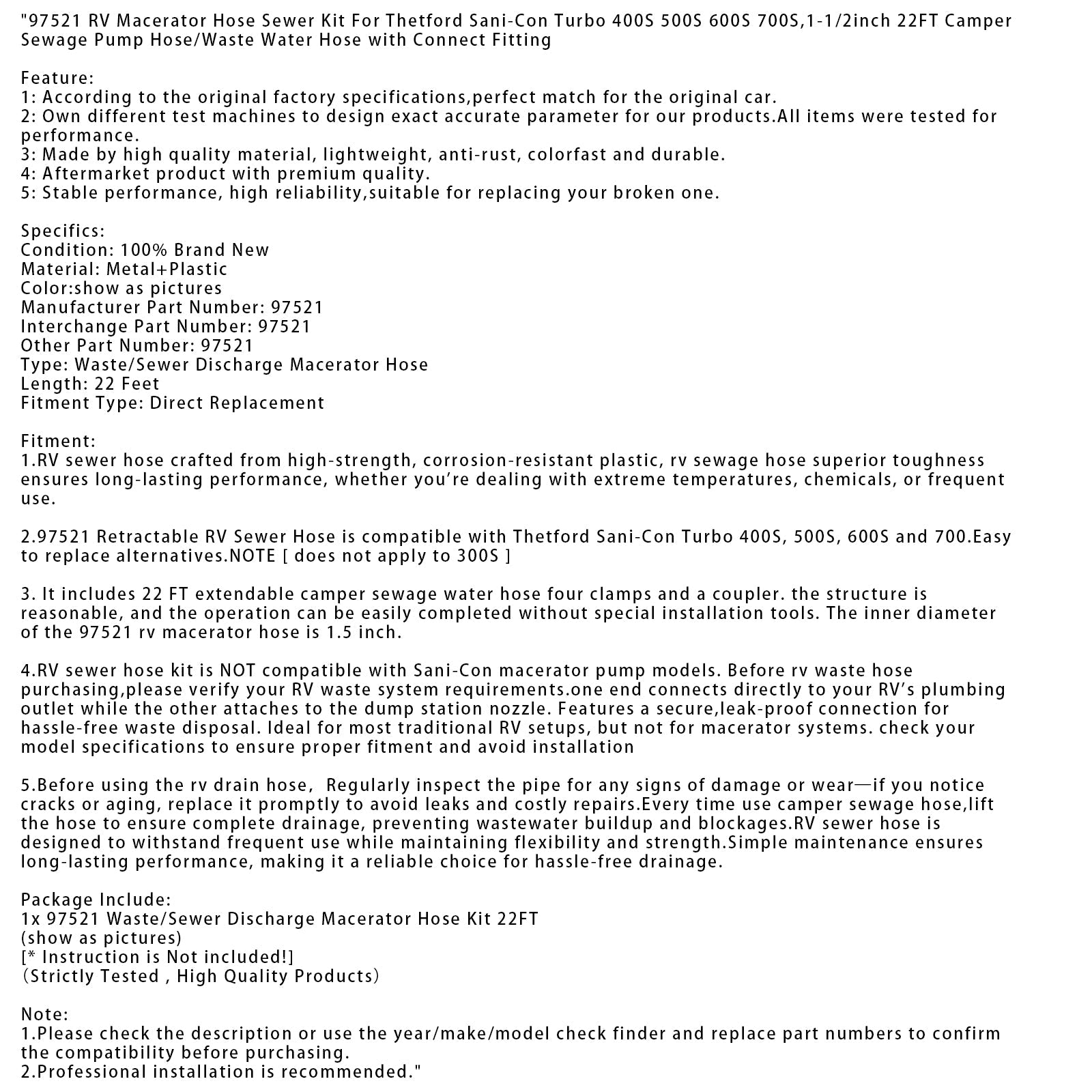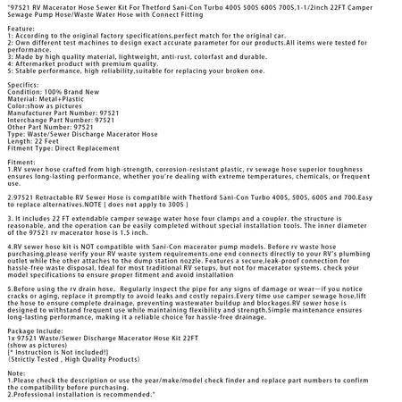 97521 RV Macerator Schlauch Kanalisation Für Thetford Sani-Con Turbo 400S 1-1/2 zoll 22FT
