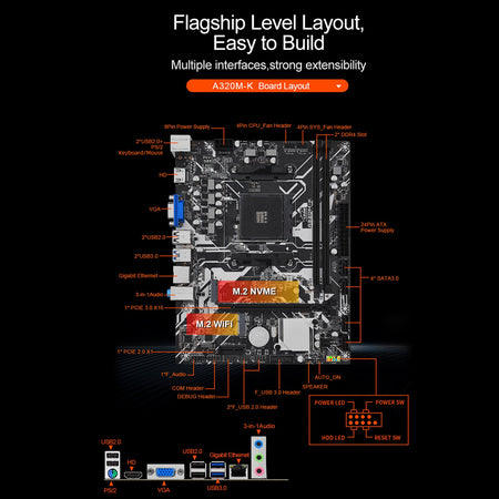 A320M-K Computer-Motherboard, Desktop, AMD-Sockel AM4, CPU unterstützt WIFI, NVME, Gigabit-Netzwerkkarte