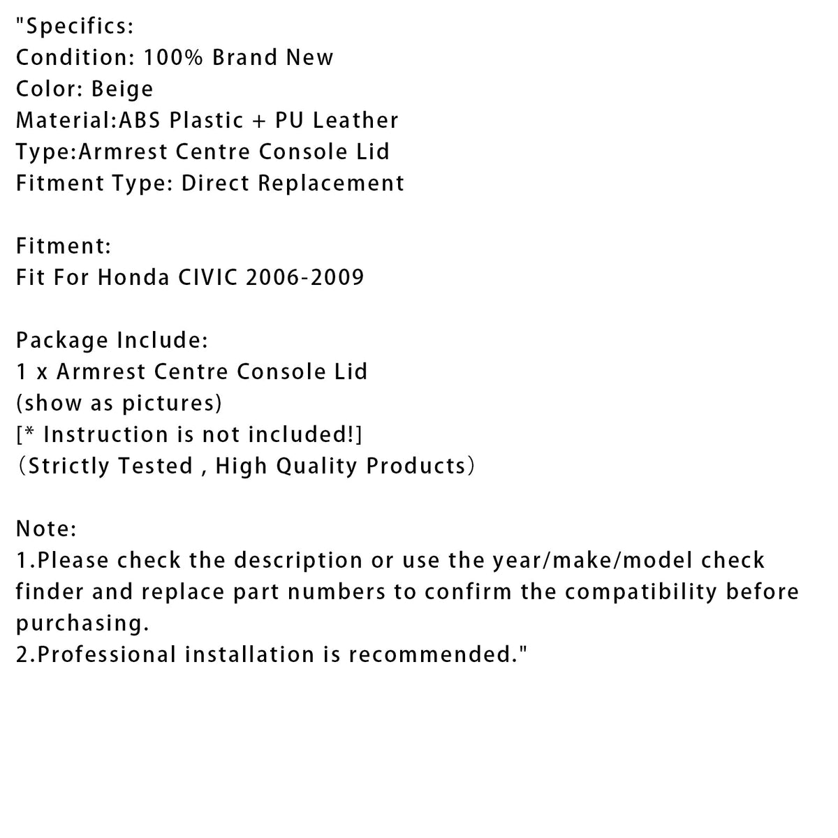2006–2009 Honda CIVIC Beige Leder Armlehne Mittelkonsole Deckel