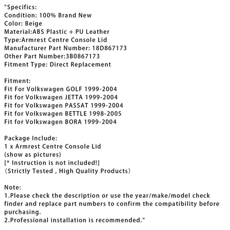 Beige Leder Armlehne Mittelkonsole Deckel Für VW MK4 Jetta Bora Golf 18D867173