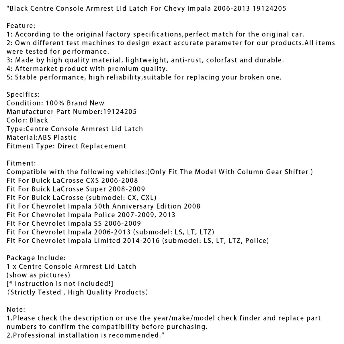 Schwarzer Mittelkonsolen-Armlehnendeckelriegel für Chevy Impala 2006-2013 19124205