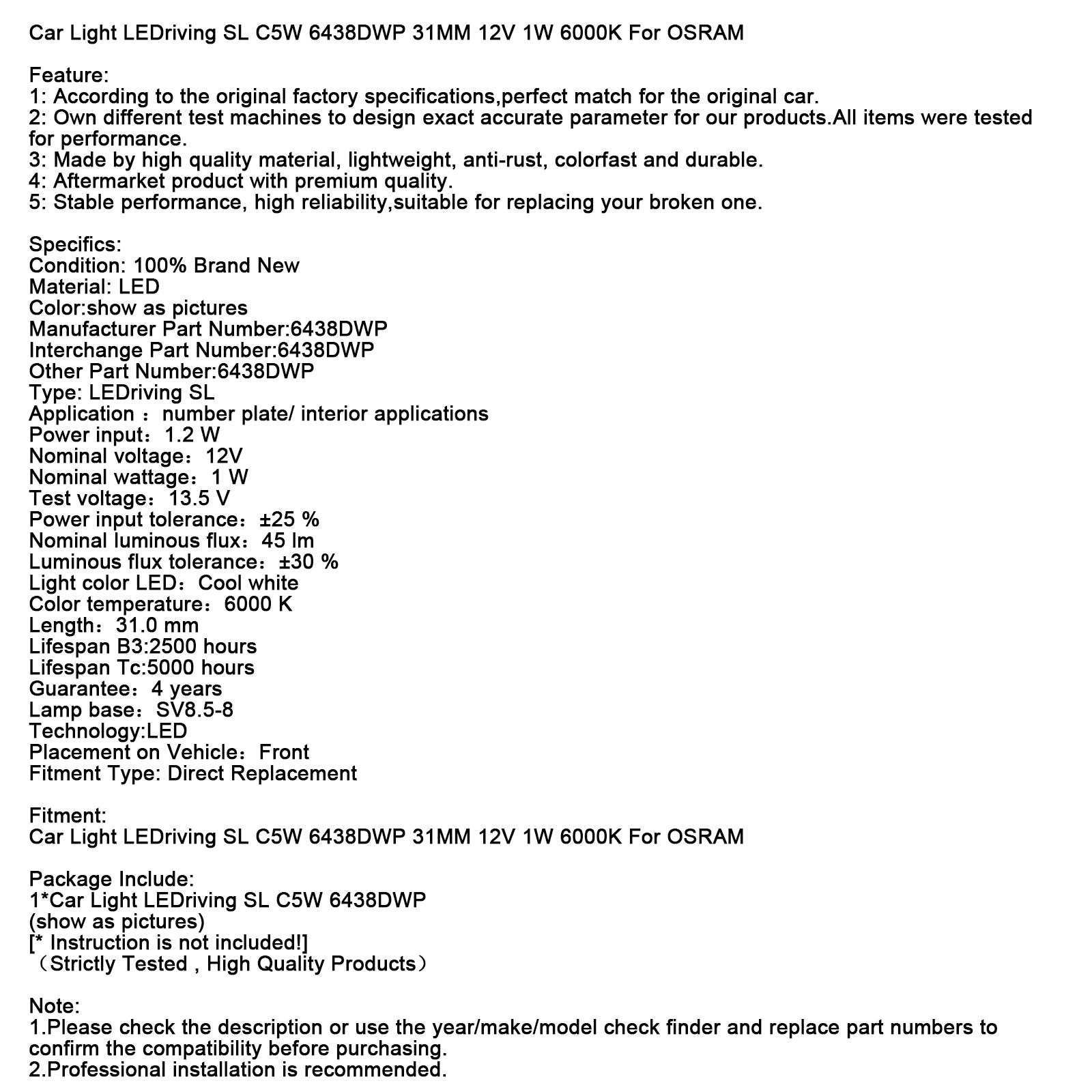 Auto Licht LEDriving SL C5W 6438DWP 31MM 12V 1W 6000K Für OSRAM