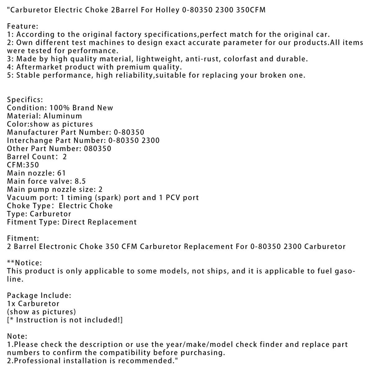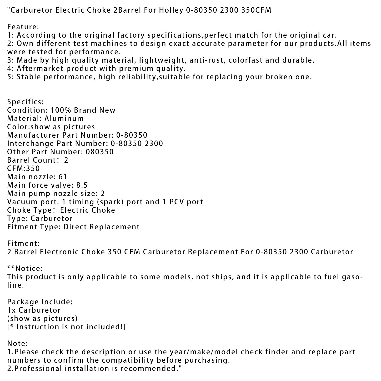 2 Barrel Elektronische Choke 350 CFM Vergaser Ersatz Für 0-80350 2300 Vergaser