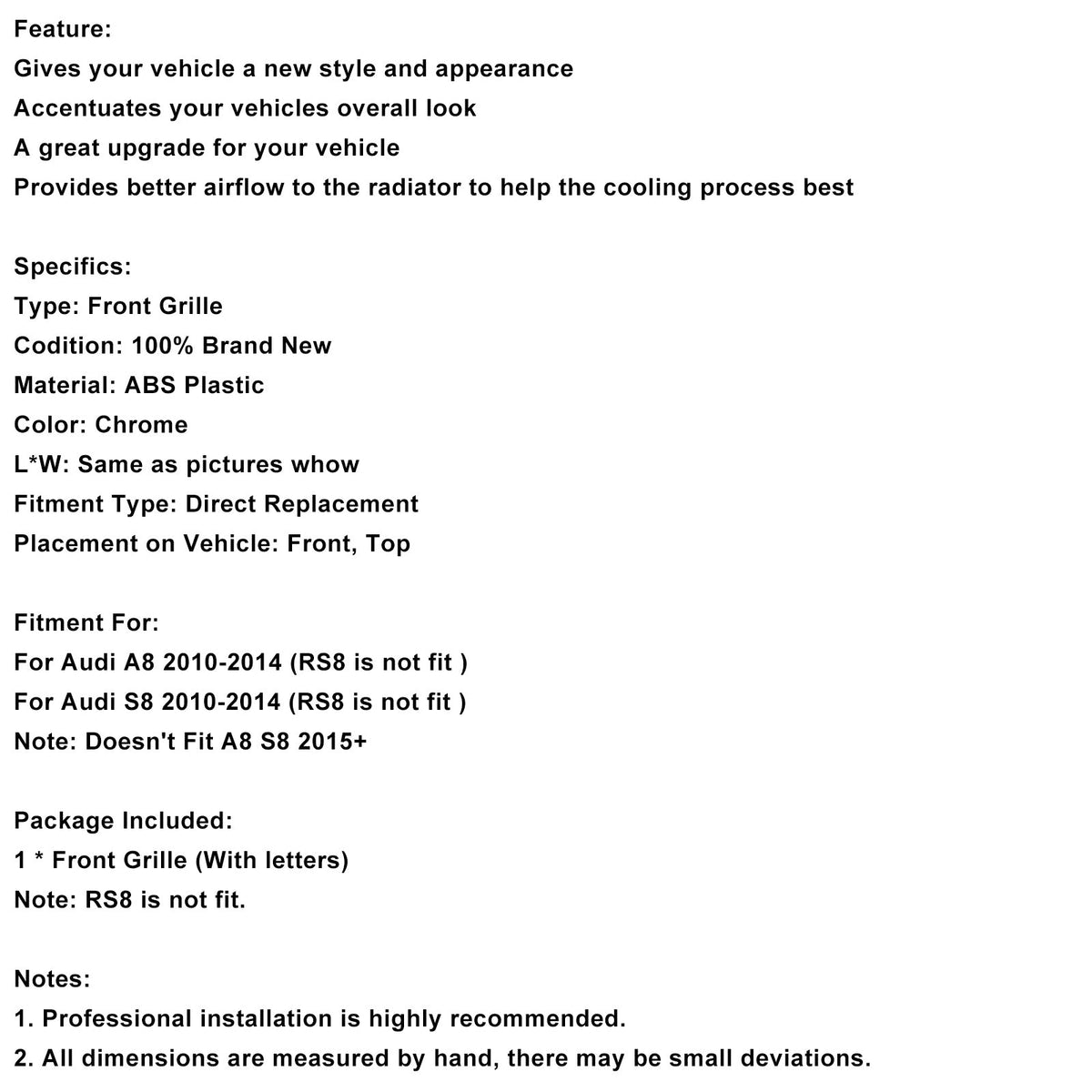 Für Audi S8 2010–2014 (RS8 ist nicht passend)