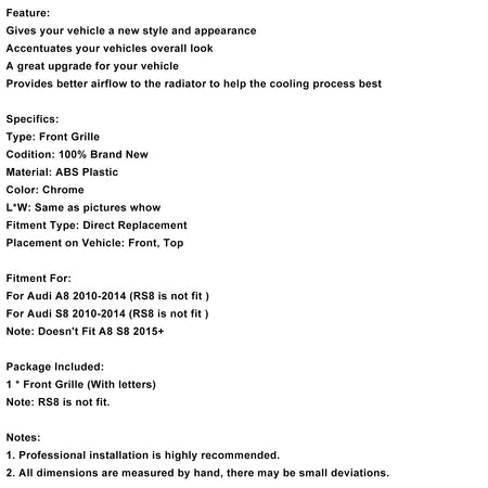 Chrom Frontstoßstange Mesh Grille Kühlergrill Fit für Audi A8 2010-2014