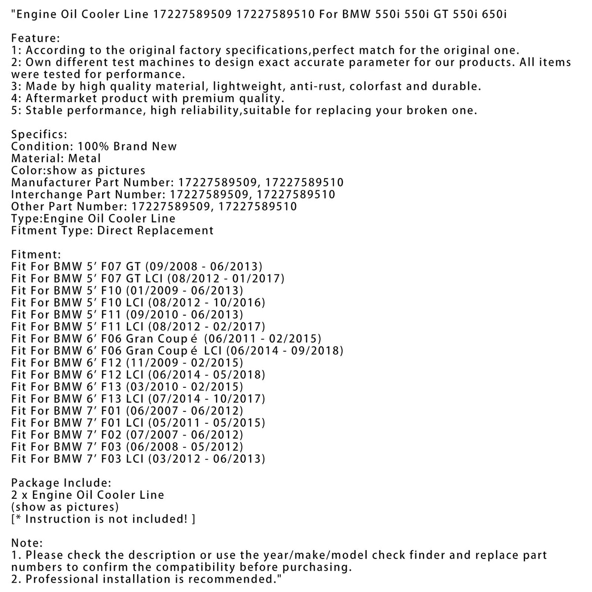 Motor?lkühlerleitung 17227589509 17227589510 Passend für BMW 550i 550i GT 550i 650i