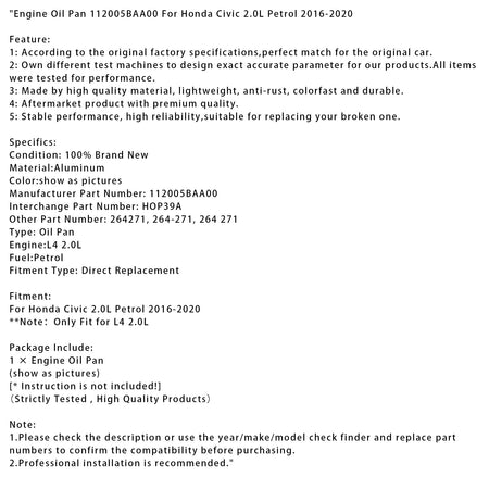 2016–2020 Honda Civic 2.0L Benzinmotor Ölwanne 112005BAA00 HOP39A