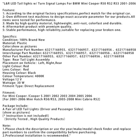 2001 2002 2003 2004 2005 2006 BMW Mini Cooper R50 R52 R53 L&R LED-Rücklichter mit Blinker