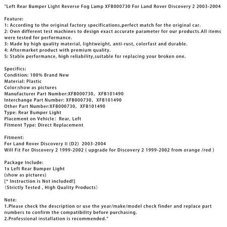 Linke hintere Stoßstangenleuchte, Rückfahrscheinwerfer, Nebelscheinwerfer XFB000730, passend für Land Rover Discovery 2 2003-2004