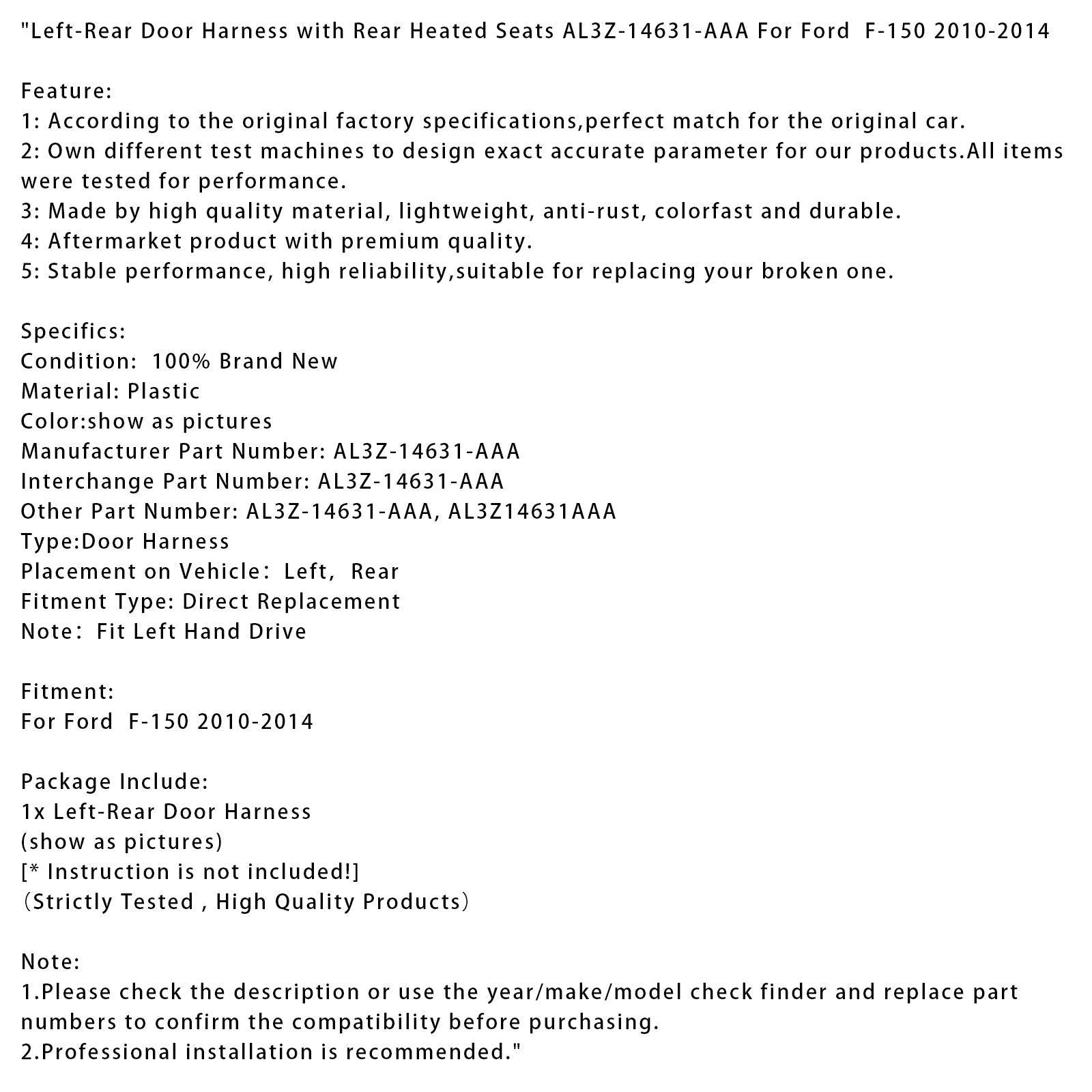 2010-2014 Ford F-150 Kabelbaum für linke hintere Tür mit beheizten Rücksitzen AL3Z-14631-AAA