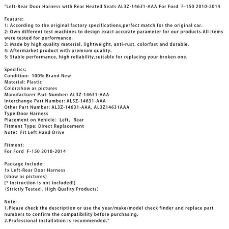 Links-Hinten Tür Harness mit Hinten Beheizte Sitze AL3Z-14631-AAA Für Ford F-150 2010-2014