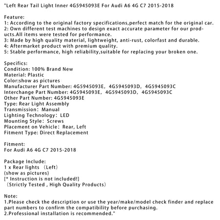 Linkes Rücklicht Innen 4G5945093E für Audi A6 4G C7 2015–2018 (Nicht geeignet für Avant/Wagon Modelle)