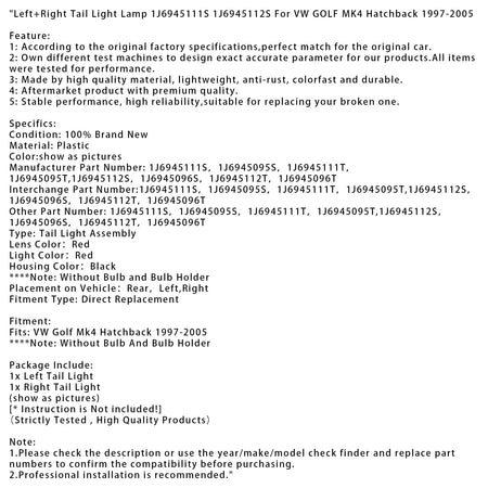 Rücklicht links + rechts für VW Golf Mk4 Schrägheck (1997–2005), Teilenummern: 1J6945111S 12S 1J6945111T