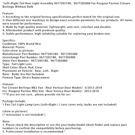 Links + Rechts Rücklicht Montage 9677205180,9677205080 Fit Für Peugeot Partner Citroen Berlingo Ohne Birne