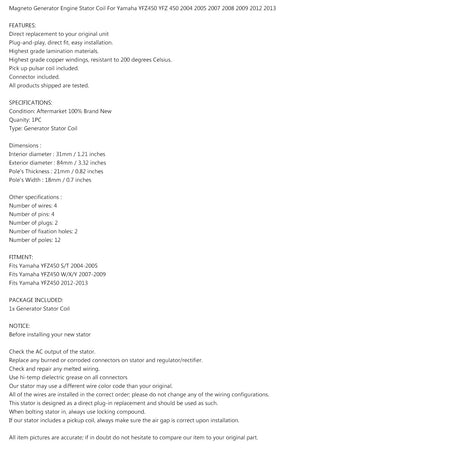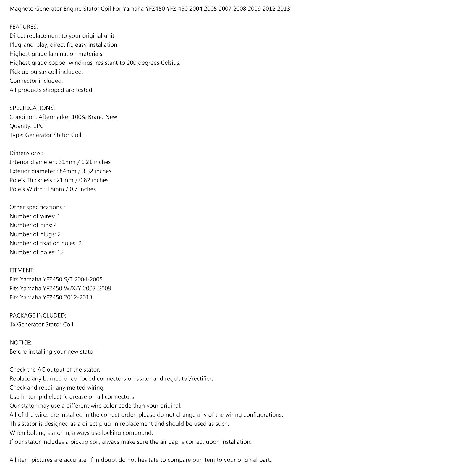 Aimant Générateur Stator pour Yamaha YFZ 450 2004 2005 2007 2008 2009 2012 2013 Générique