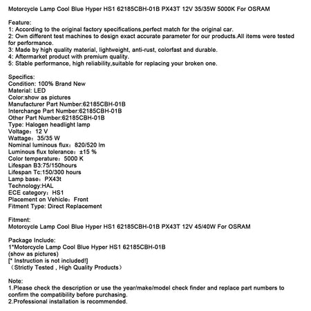 Motorradlampe Cool Blue Hyper HS1 62185CBH-01B PX43T 12V 35/35W 5000K Für OSRAM