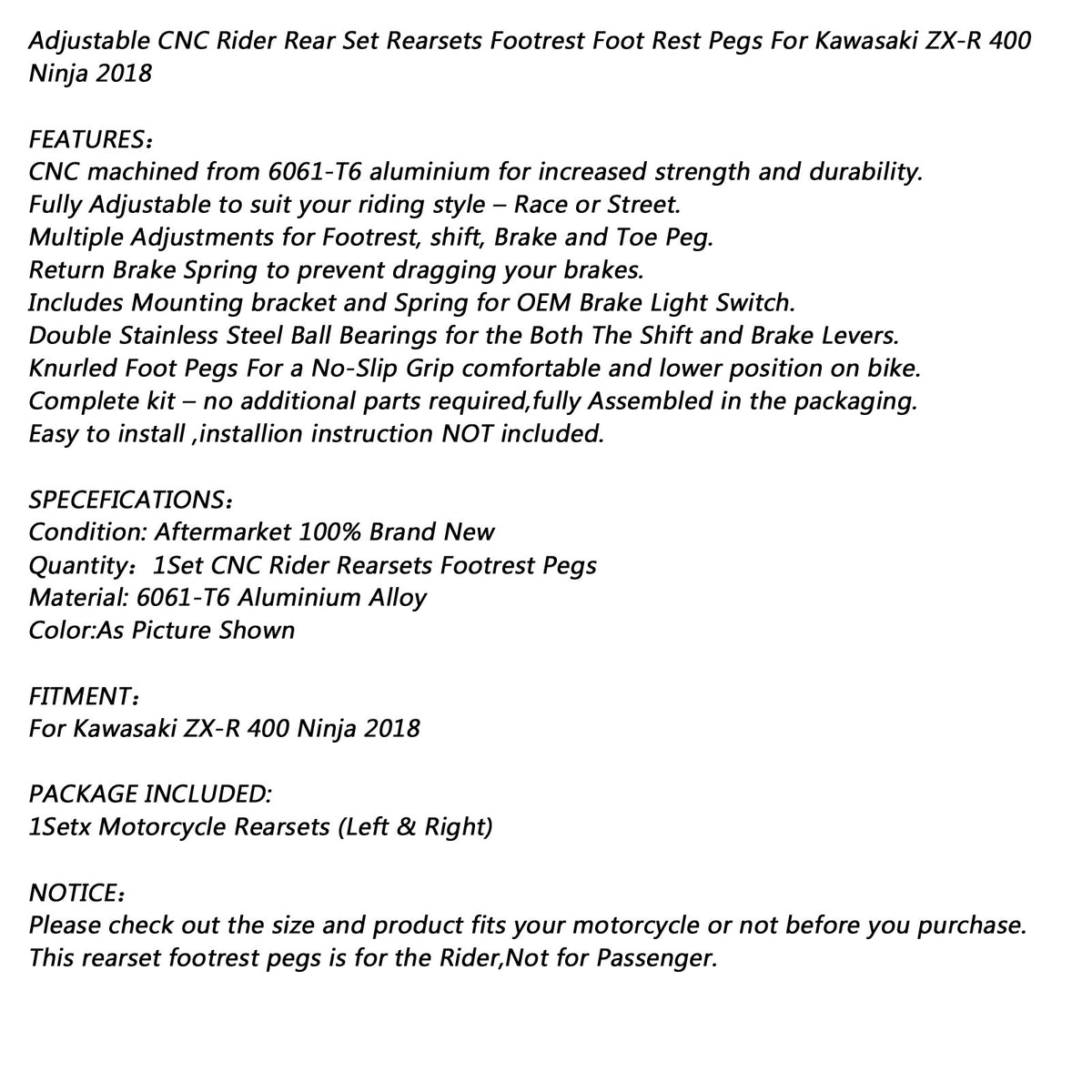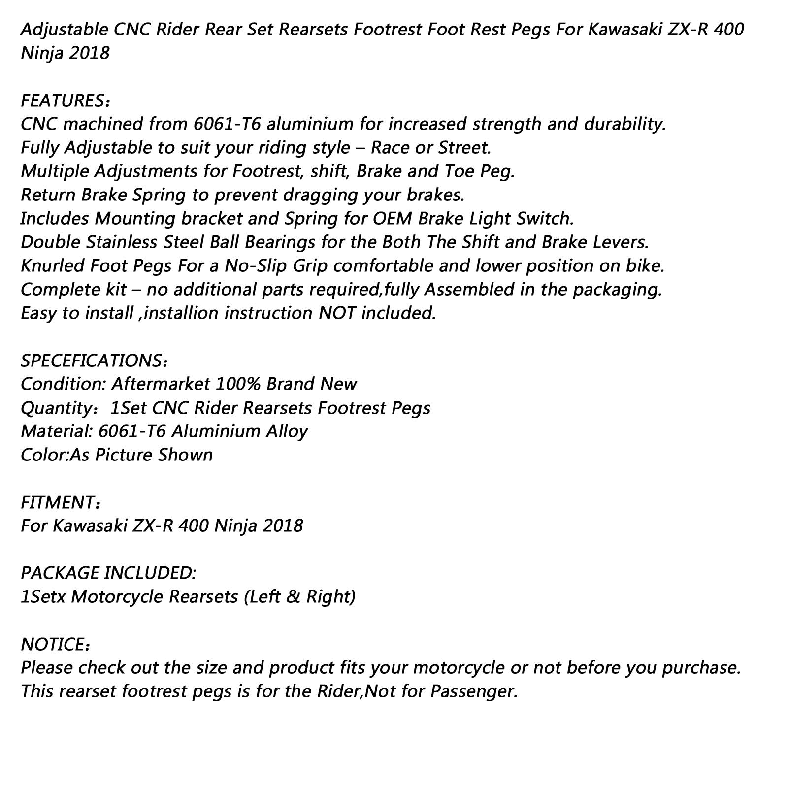 Einstellbare CNC-Fahrer-Fußrastenanlage Fußrasten Fußrasten für Kawasaki ZX-R ZXR 400 Ninja 2018