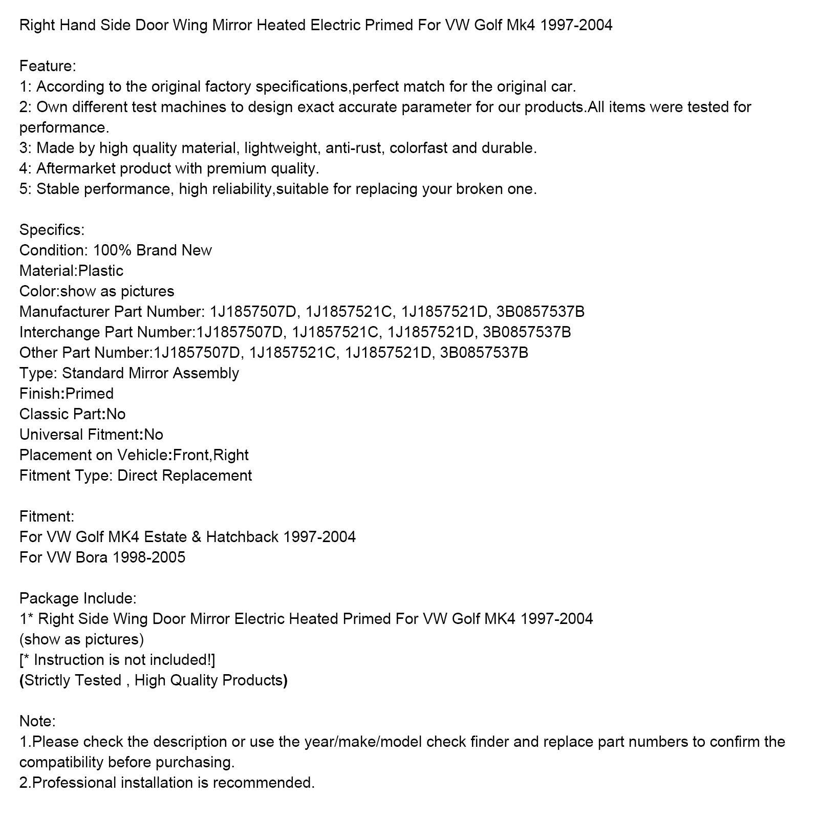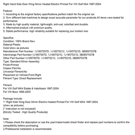 Rechte Seite Tür Flügel Spiegel Beheizt Elektrische Grundiert Für VW Golf Mk4 1997-2004
