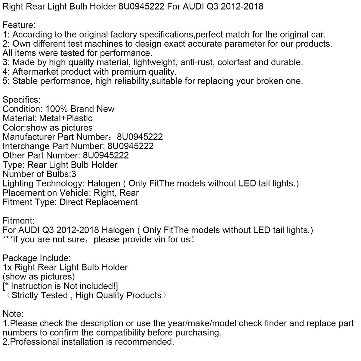 Rechts Hinten Glühbirne Halter 8U0945222 Für AUDI Q3 2012-2018