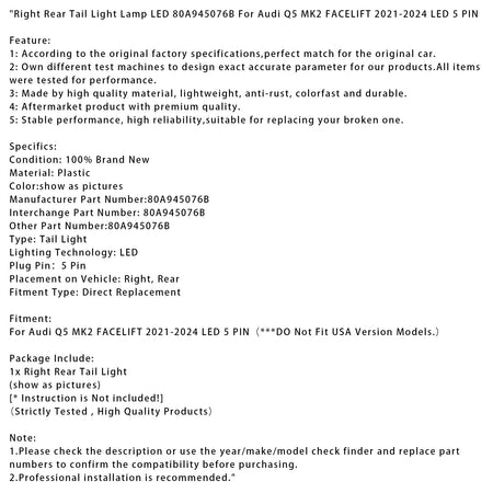 Für Audi Q5 MK2 Facelift 2021-2024 LED 5-PIN (***Nicht passend für US-Versionen.)