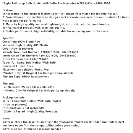 2007–2010 Mercedes W204 C-Klasse Rücklicht rechts Lampenfassung mit Glühbirnen