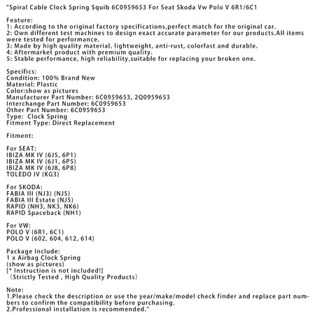 Spiralkabel Wickelfeder Zündpille 6C0959653 Für Seat Skoda Vw Polo V 6R1/6C1