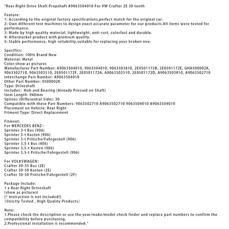 Hinten Rechts Antriebswelle Innenwelle A9063504010 Für VW Crafter 2E 30 zahn