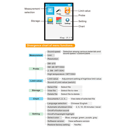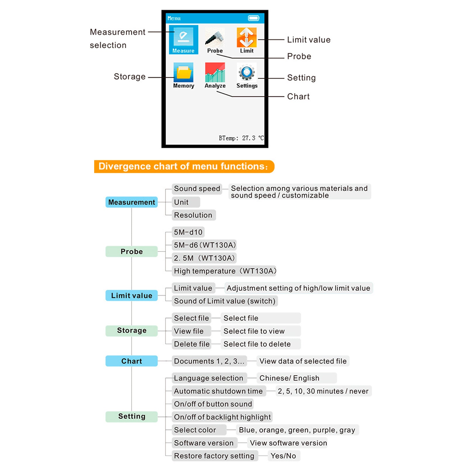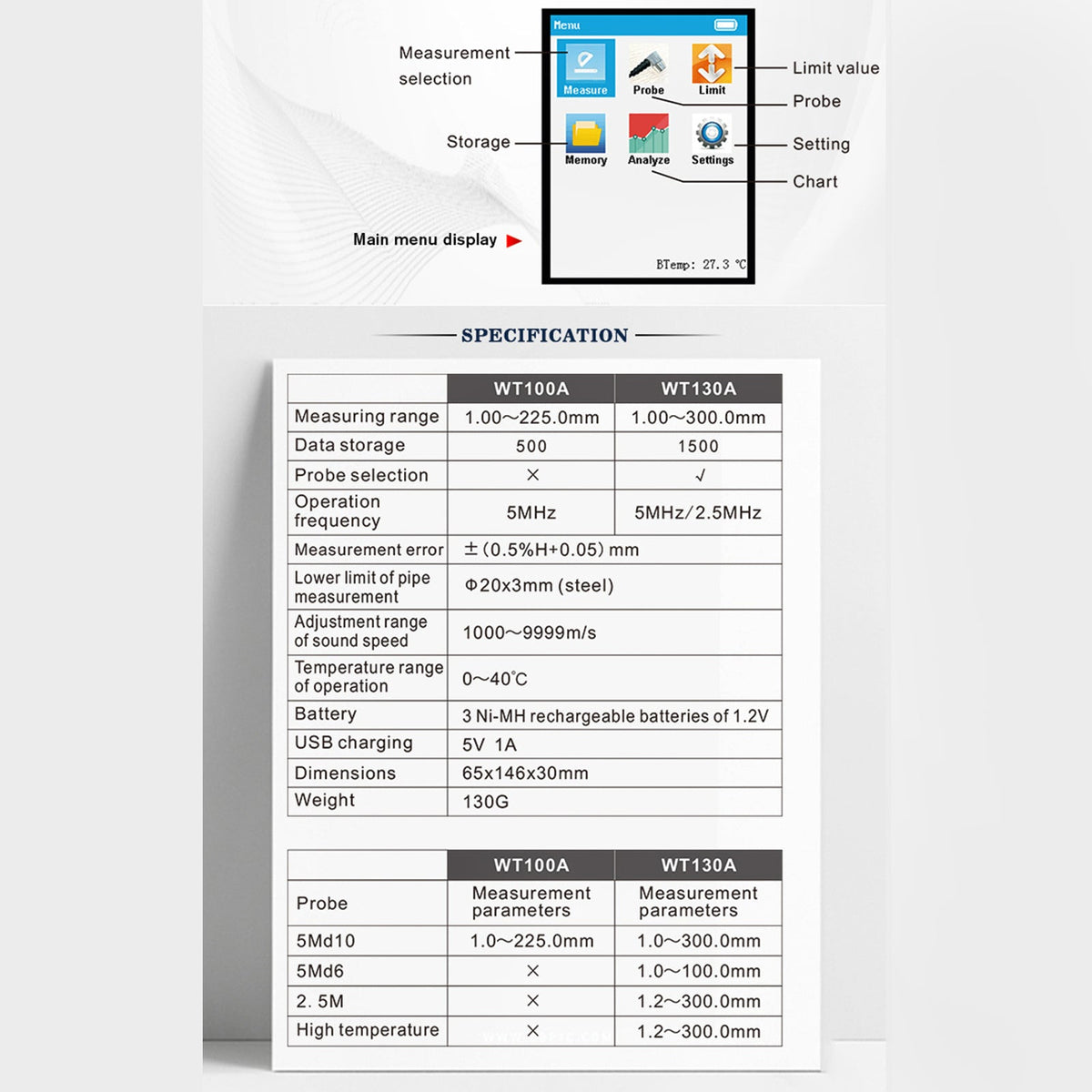 WT100A Outil de testeur LCD Capteur intelligent Jauge d'épaisseur à ultrasons Vitesse du son