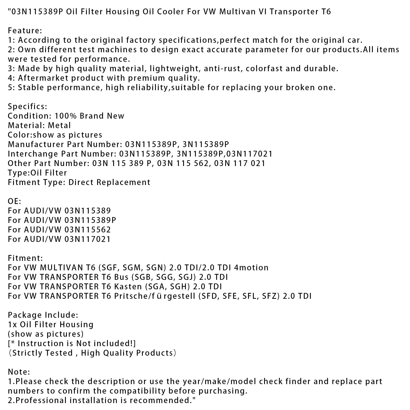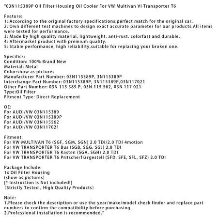 03N115389P Ölfiltergehäuse Ölkühler für VW Multivan VI Transporter T6