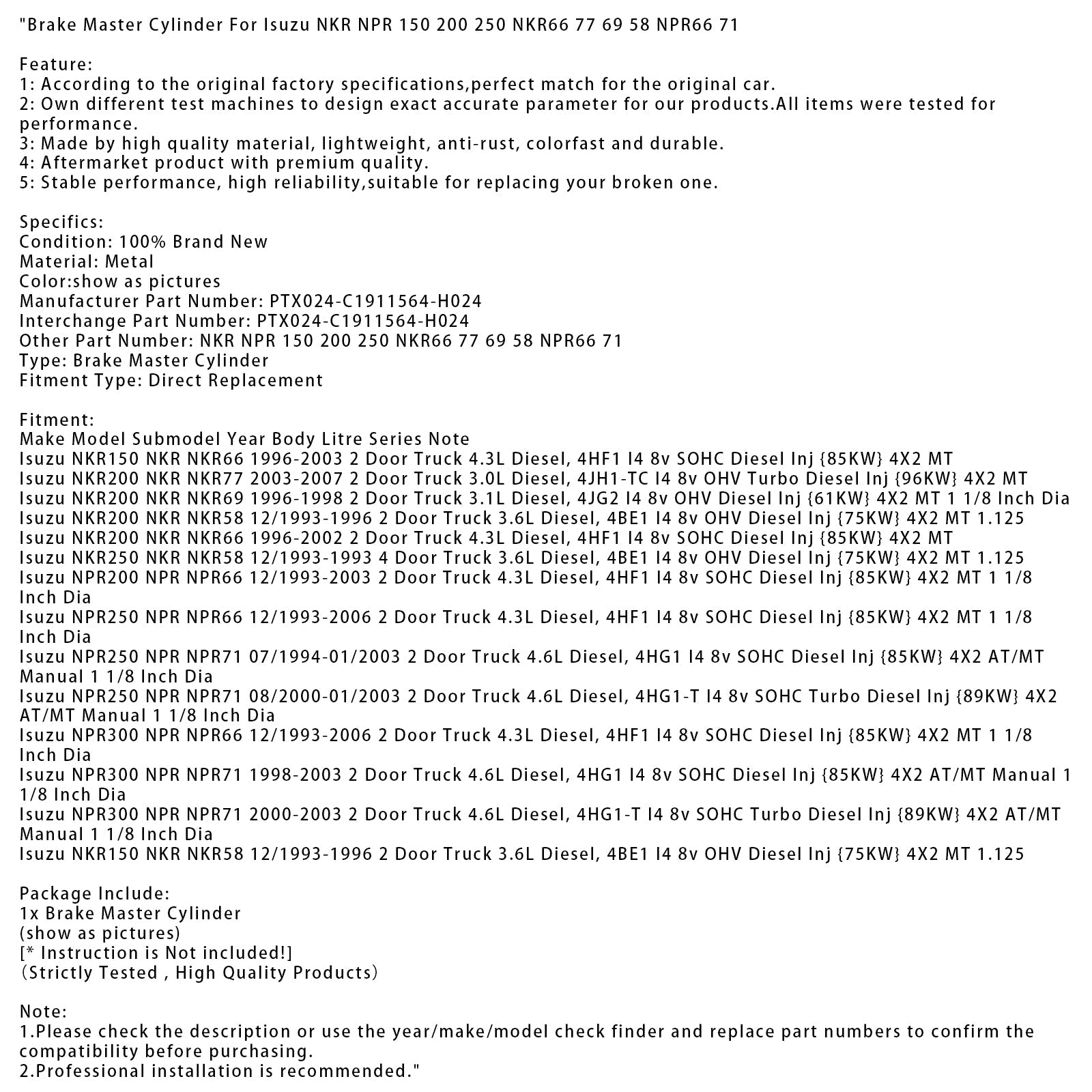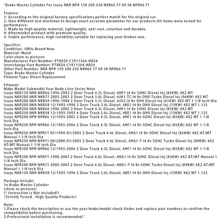 08/2000-01/2003 Isuzu NPR250 NPR NPR71 2-türiger LKW 4,6 l Diesel Hauptbremszylinder PTX024-C1911564-H024 NKR66